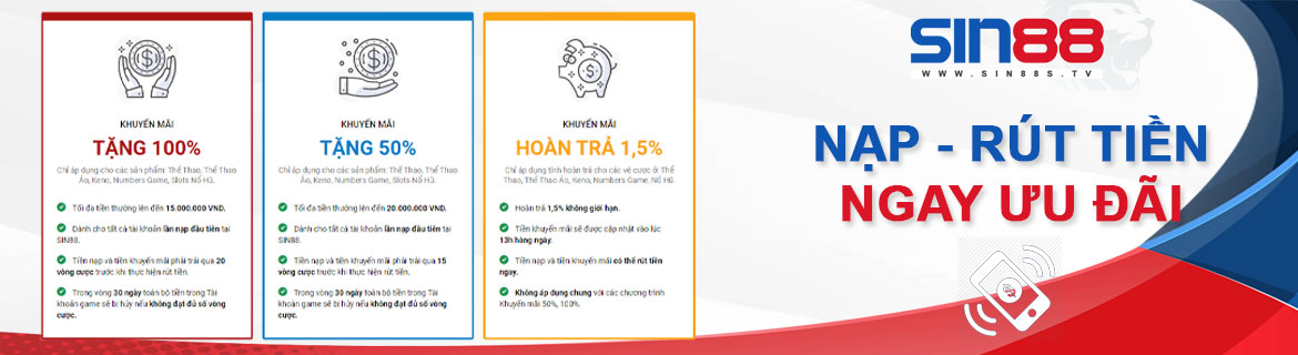 - Ưu đãi nạp tiền định kỳ: Sin88 thường xuyên cung cấp các chương trình khuyến mãi cho các lượt nạp tiền định kỳ, như hàng tuần hoặc hàng tháng. Những ưu đãi này có thể bao gồm các khoản thưởng tiền mặt, hoặc phần trăm thưởng cho số tiền nạp vào tài khoản.